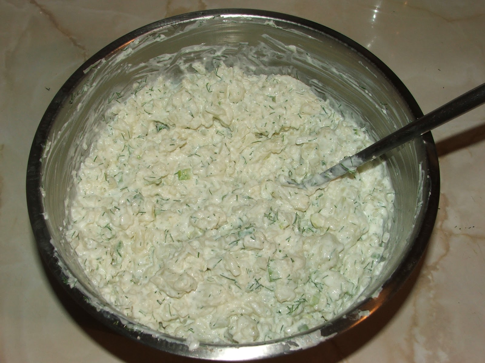 Am adăugat apoi iaurtul, sarea și piperul și am amestecat. Eu am pus și puțin ulei, cu toate că rețeta originală nu conține acest ingredient, însă mie mi se pare că se leagă mai bine.
